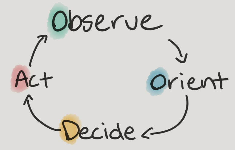 The OODA loop, created by military strategist John Boyd, is an acronym for “observe, orient, decide, act.” It is a cyclic process that emphasizes rapid decision-making and adaptability, enabling individuals or organizations to respond quickly to changing situations. The OODA loop consists of the following stages: